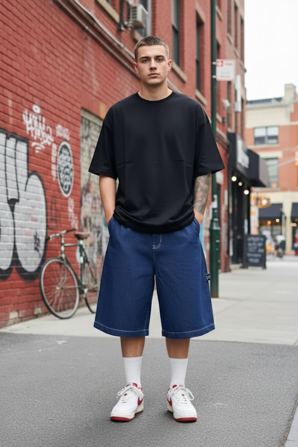 HOW DO DARK BLUE JORTS TRANSFORM AN EVERYDAY LOOK INTO A STREETWEAR DREAM?